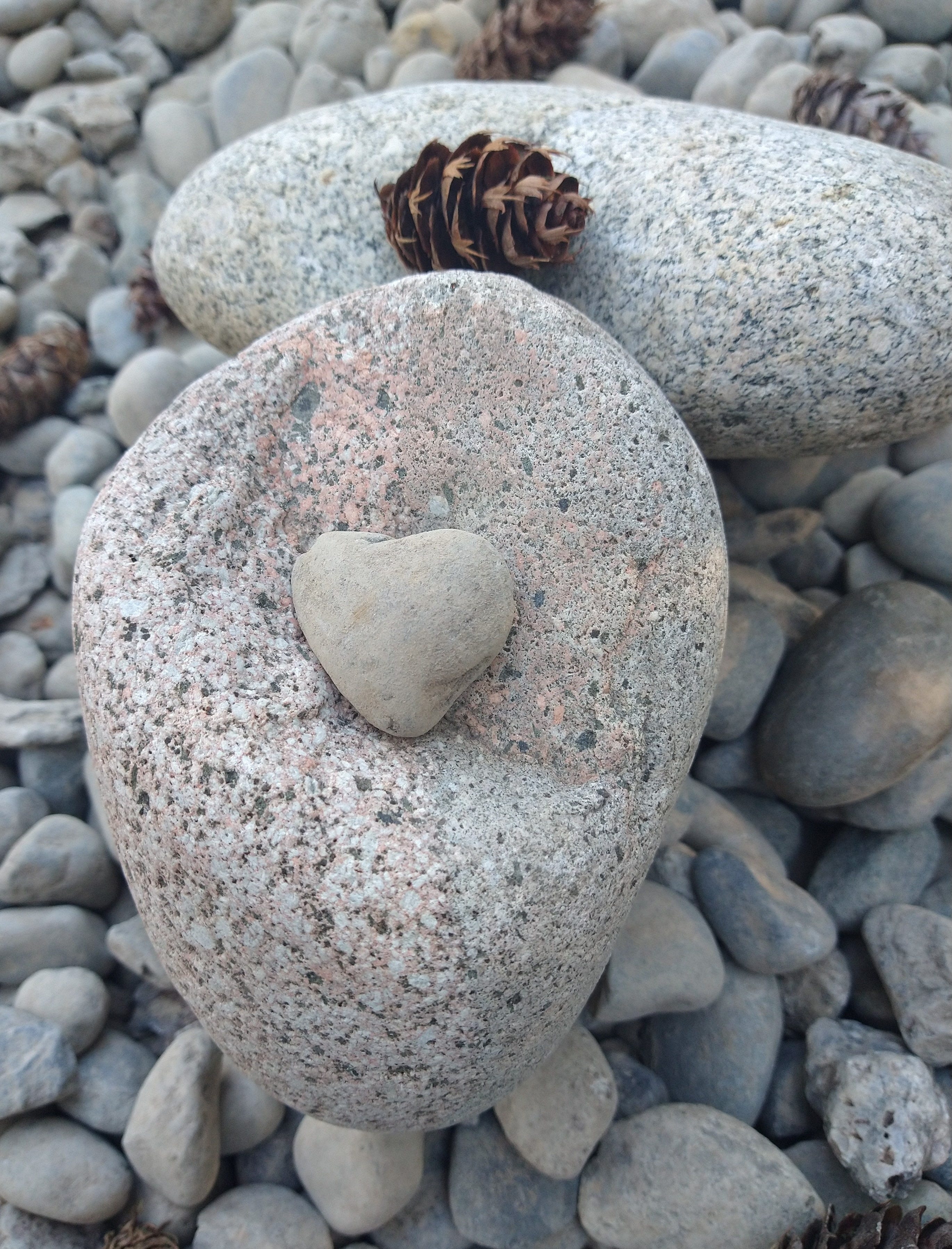 Suddenly I felt something in my left hands. I looked down, it’s another smaller, rock in a heart shape. It felt as if it leapt into my hands when I was thinking those thoughts. So there it is, a baby heart, sleeping in the cradle, in the presence of the big heart.